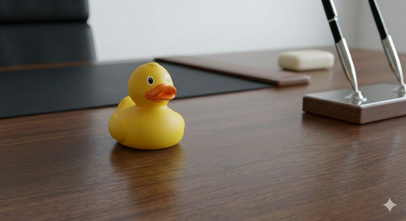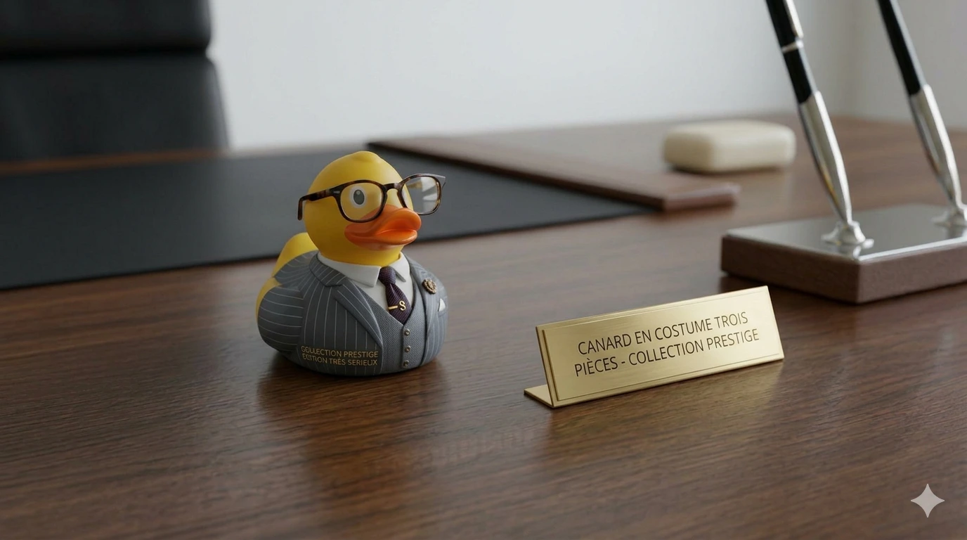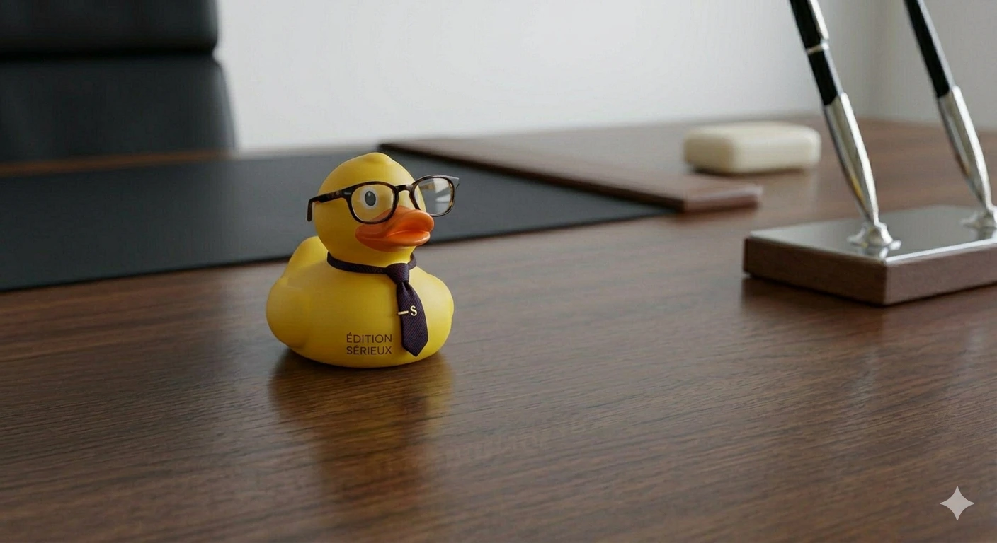 Sérieux pour les bugs qui méritent d'être assis. Le Rubber Pro est équipé de lunettes rondes qui lui confèrent une autorité intellectuelle sans équivalent dans le monde des palmipèdes. Une heure pour déballer, structurer, et trouver. Convient pour : bugs logiques, problèmes d'état, erreurs asynchrones, comportements inexplicables qui s'expliquent en les disant.
